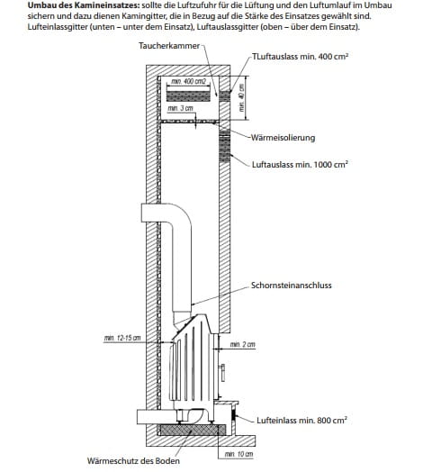 Mindestabstand des Kamineinsätzes von nicht brennbaren Elemennten (Isolierung): von 12-15cm