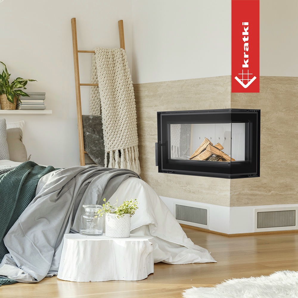 KRATKI Stahl Eck-Kamineinsatz - SIMPLE S rechts BS (6kW) Ø 150 mit passendes Lufteinlass - Brennkammer schwarz