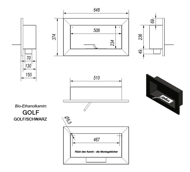 Biokamin - GOLF Schwarz - TÜV/Wandkamin (64,8 x37,4)cm