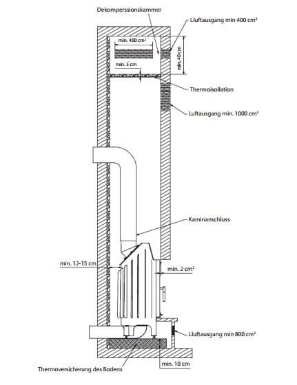 Anschlussrohre und Putzlöcher sollen von den unbedeckten leichtbrennbaren Bauteilen des Wohngebäudes nicht weniger als 60 cm entfernt werden und von den bedeckten mit wenigstens 25mm dickem Zementputz nicht weniger als 30 cm.Mindestabstand des Kamineinsätzes von nicht brennbaren Elemennten (Isolierung): von 12-15cm. Mindestabstand des eingebauten Kamineinsätzes von brennbaren Elemennten: Seitlich- 60 cm, vor der Kamintür -100 cm