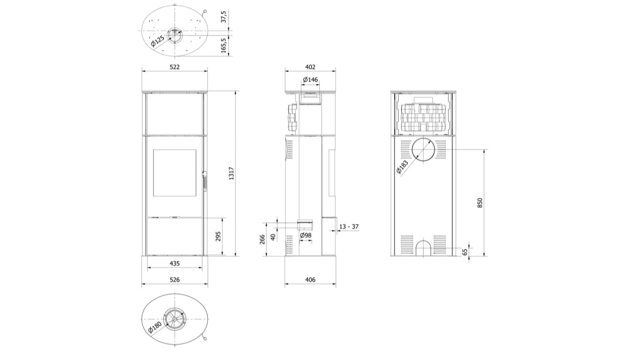 Der Ofen besitzt einen eingebauten Regler der Zufuhr der Luft von außen – einen Zuluftstutzen Ø 100 mm.