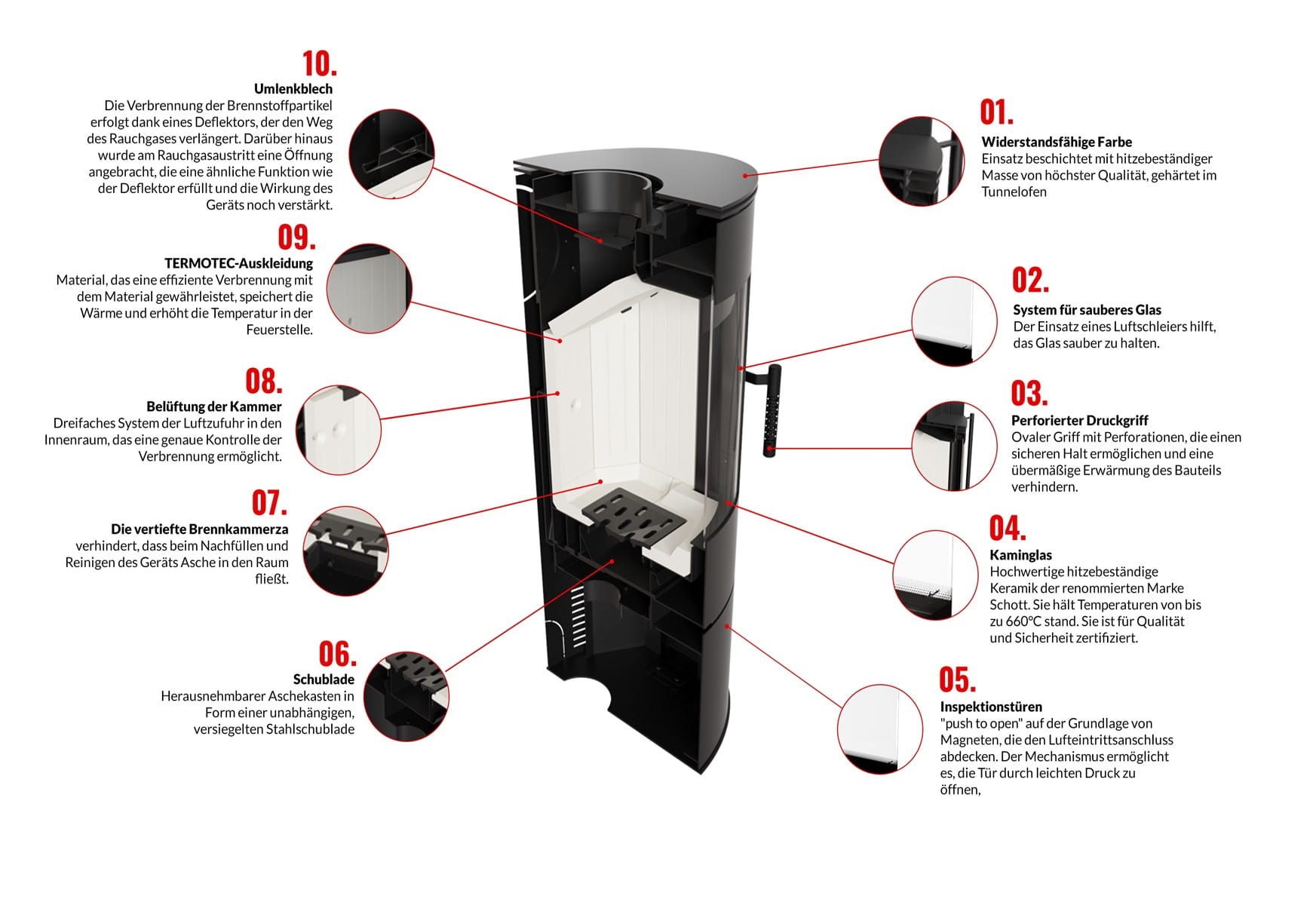 - Deflektor zur Verlängerung des Rauchgasweges für eine optimale Energieausnutzung,