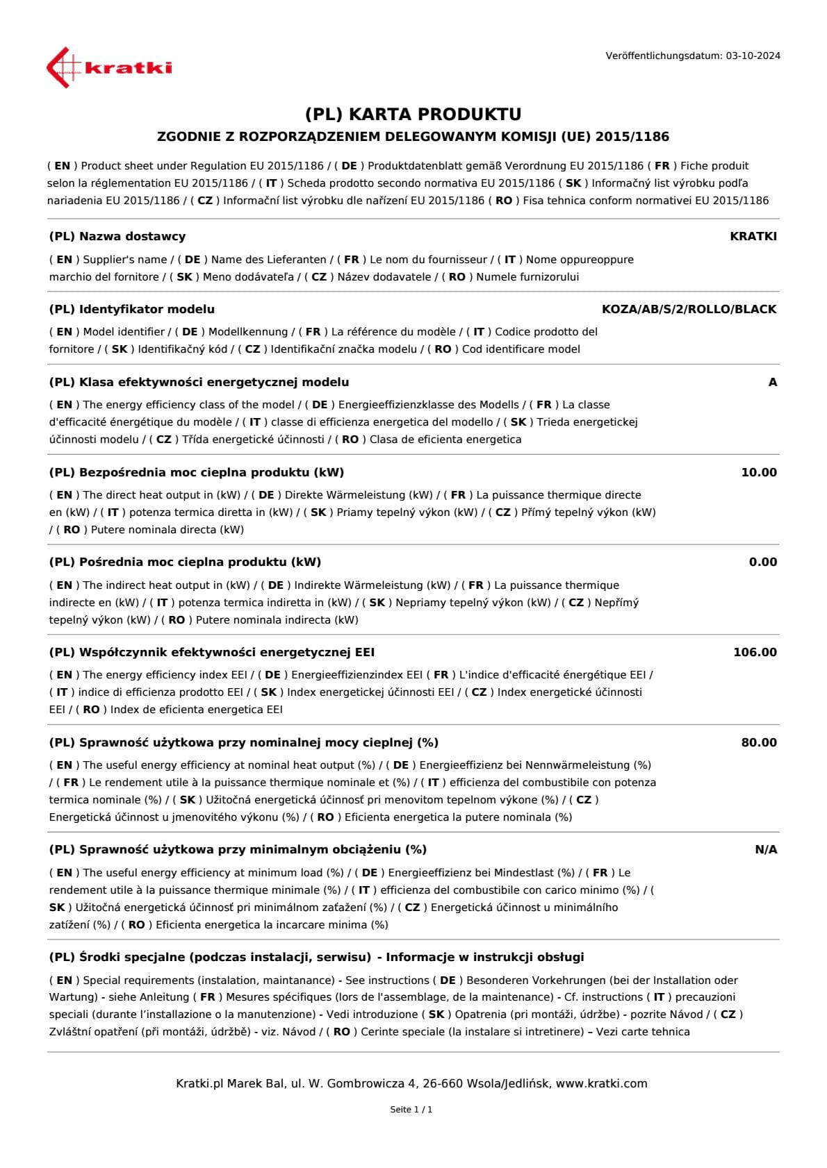 KOZA/AB/S/2/ROLLO/BLACK erfüllt die Emissionsgrenzwerte von EKOPROJECT.