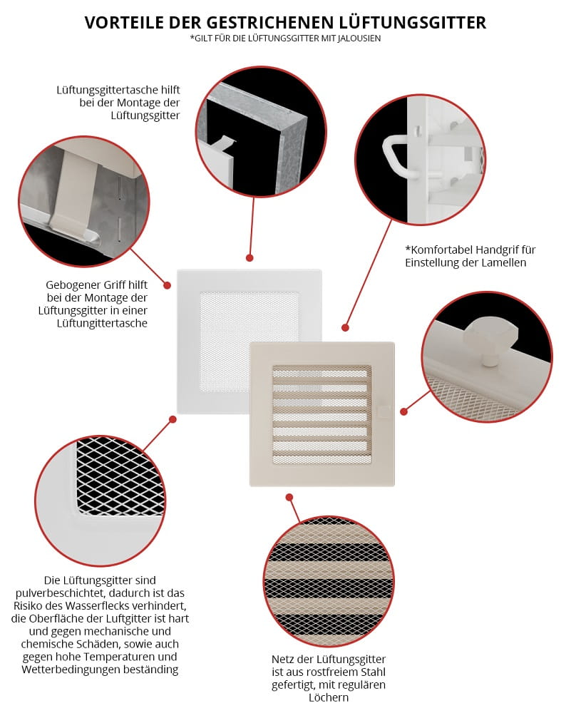 Die Lüftungsgitter sind pulverbeschichtet, dadurch ist das Risiko des Wasserflecks verhindert, die Oberfläche der Luftgitter ist hart und gegen mechanische und chemische Schäden, sowie auch gegen hohe Temperaturen und Wetterbedingungen beständig.
